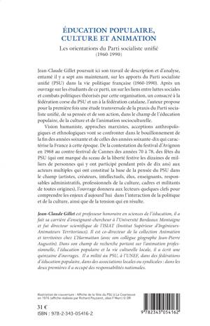 Jean-Claude Gillet poursuit ici son travail de description et d'analyse sur les apports du Parti socialiste unifié (PSU) dans la vie politique française (1960-1990). Après un ouvrage sur les étudiants de ce parti, un sur les liens entre luttes sociales et combats politiques théorisés par cette organisation, un consacré à la fédération corse du PSU et un à la fédération catalane, l'auteur propose pour la première fois une étude transversale de la praxis du Parti socialiste unifié, de sa pensée et de son action, dans le champ de l'éducation populaire, de la culture et de l'animation socioculturelle.