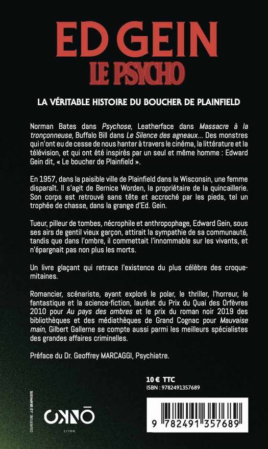 Plongez dans l’esprit dérangé d’Ed Gein, l’un des criminels les plus glaçants de l’histoire, dont les atrocités ont inspiré des figures cultes comme Norman Bates (Psychose), Leatherface (Massacre à la tronçonneuse) et Buffalo Bill (Le Silence des Agneaux). Ed Gein, le Psycho, aux éditions OKNO, vous dévoile les détails les plus troublants de cette affaire qui a marqué l’Amérique à jamais. Oserez-vous affronter la vérité derrière la légende en format poche ?