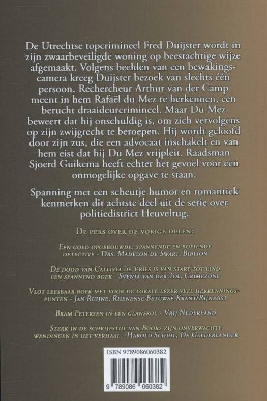 De Utrechtse topcrimineel Fred Duijster wordt in zijn zwaarbeveiligde woning op beestachtige wijze afgemaakt. Volgens beelden van een bewakingscamera kreeg Duijster bezoek van slechts één persoon. Rechercheur Arthur van der Camp meent in hem Rafaël du Mez te herkennen, een berucht draaideurcrimineel. Maar Du Mez beweert dat hij onschuldig is, om zich vervolgens op zijn zwijgrecht te beroepen. Hij wordt geloofd door zijn zus, die een advocaat inschakelt op voorwaarde dat deze Du Mez vrijpleit. Raadsman Sjoerd Guikema heeft echter het gevoel voor een onmogelijke opgave te staan. Spanning met een scheutje humor en romantiek kenmerken dit achtste deel uit de serie over politiedistrict Heuvelrug.