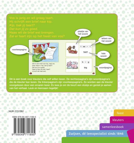 Kleuters samenleesboeken: Een samenleesboek voor kleuters. De rechterpagina’s zijn woordpagina’s die de kleuter leest. De linkerpagina’s zijn voorleespagina’s voor de ervaren lezer. Ga er eens lekker voor zitten en lees gezellig samen in dit boek. Vos is jarig en wil graag taart. Hij schrijft een brief naar kip. Kip, wil jij taart bakken? Dat kan jij heel goed! Haas wil de brief wel brengen. Zal er taart zijn op het feest van vos?