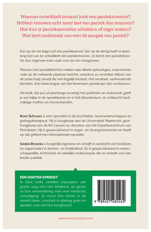 Waarom ontwikkelt iemand juist een paniekstoornis? Hebben vrouwen echt meer last van paniek dan mannen? Hoe kun je paniekaanvallen uitlokken of erger maken? Wat leert onderzoek ons over de aanpak van paniek? Een op de vier krijgt ooit een paniekaanval. Een op de dertig heeft er jarenlang last van en ontwikkelt een paniekstoornis. Zo komt een paniekstoornis dus ongeveer even vaak voor als een maagzweer. Mensen met paniekklachten zoeken naar allerlei oplossingen, maar komen vaak op de verkeerde plaatsen terecht, waardoor ze verstoken blijven van de juiste hulp, terwijl die wel degelijk bestaat. Het resultaat: aanhoudende klachten. Een beter begrip van het fenomeen paniek kan dat voorkomen. Dit boek, dat put uit jarenlange ervaring met patiënten en onderzoek, geeft je een kijkje in de spreekkamer en in het laboratorium, en ontkracht hardnekkige mythes en misverstanden.