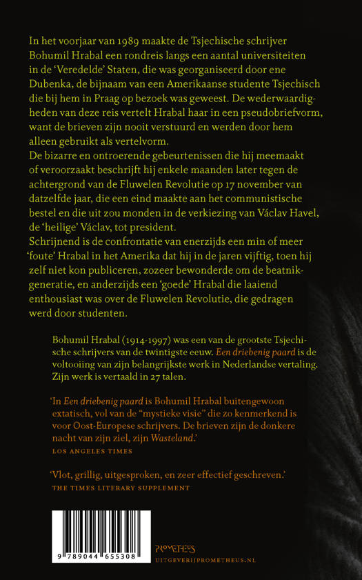 ‘In Een driebenig paard is Bohumil Hrabal buitengewoon extatisch, vol van de “mystieke visie” die zo kenmerkend is voor Oost-Europese schrijvers. De brieven zijn de donkere nacht van zijn ziel, zijn Wasteland.’