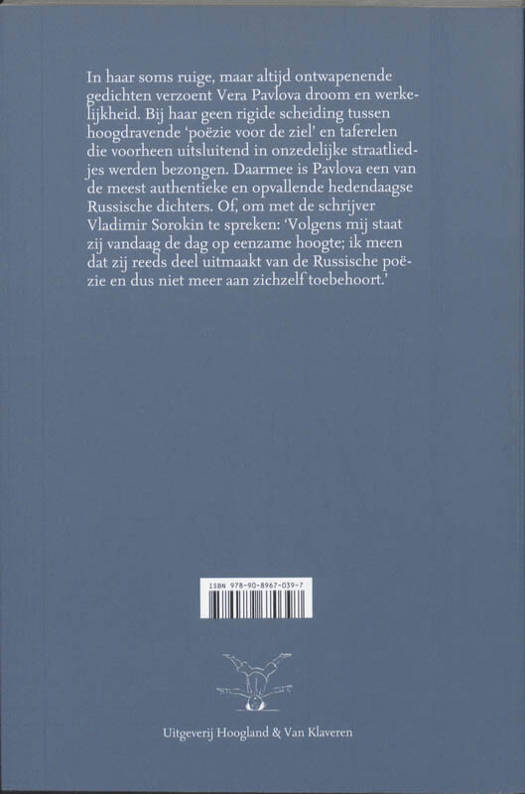 Vera Pavlova (Moskou, 1963) was leerlinge aan het Schnittke Muziekcollege, zong in een kerkkoor, studeerde af als muziekhistorica en brak drie jaar later door met onthullende gedichten die menig lezer met verdrongen herinneringen, verzwegen ervaringen en latente verlangens confronteerden. Pavlova blijft het liefst uit de schijnwerpers. Om met haar eigen woorden te spreken: