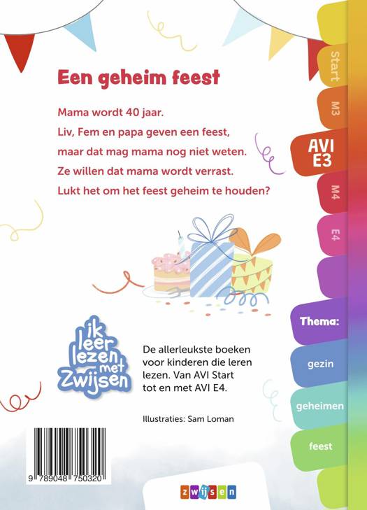 Liv, Fem en papa organiseren een verrassingsfeest voor mama, omdat ze 40 jaar wordt. Maar wat is het moeilijk om dat geheim te houden. Het gaat een paar keer bijna mis en dat maakt dit verhaal zo heerlijk om te lezen. Herkenbaar verhaal voor beginnende lezers op AVI E3.
