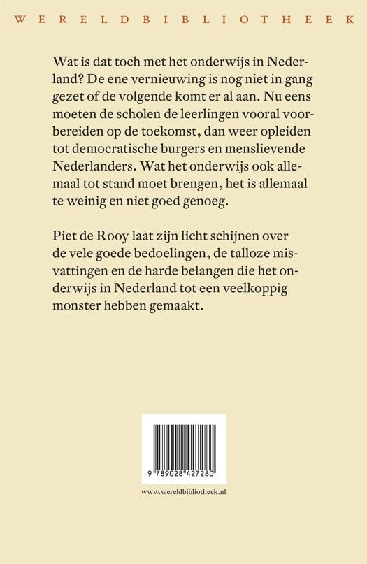 Wat is dat toch met het onderwijs in Nederland? De ene onderwijsvernieuwing is nog niet in gang gezet of de volgende komt er al aan. Nu eens sluit het onderwijs niet goed aan op wat de toekomst van de leerlingen vraagt, dan weer leidt het niet voldoende op tot menslievende en democratische Nederlanders. Wat het onderwijs ook allemaal tot stand moet brengen, het is nooit goed genoeg. Piet de Rooy onderzoekt op eigenzinnige wijze waar deze hooggespannen verwachtingen vandaan komen. Dat doet hij deels aan de hand van de loopbanen van zijn vader en van hemzelf. Zijn vader werkte zijn leven lang in het onderwijs, De Rooy studeerde historische pedagogiek en was hoogleraar. De Rooy gaat echter nog veel verder terug, naar het vroegste stadium van het onderwijs. Van daaruit laat hij zijn licht schijnen over de vele goede bedoelingen, de talloze misvattingen en de harde belangen die het onderwijs in Nederland tot een veelkoppig monster hebben gemaakt