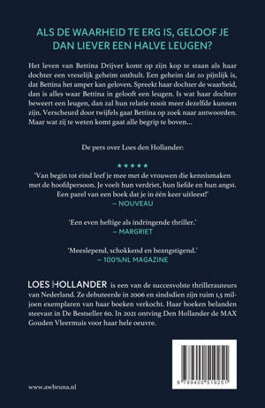 Het leven van Bettina Drijver komt op zijn kop te staan als haar dochter een vreselijk geheim onthult. Een geheim dat zo pijnlijk is, dat Bettina het amper kan geloven. Spreekt haar dochter de waarheid, dan is alles waar Bettina in gelooft een leugen. Is wat haar dochter beweert een leugen, dan zal hun relatie nooit meer dezelfde kunnen zijn. Verscheurd door twijfels gaat Bettina op zoek naar antwoorden. Maar wat zij te weten komt gaat alle begrip te boven…