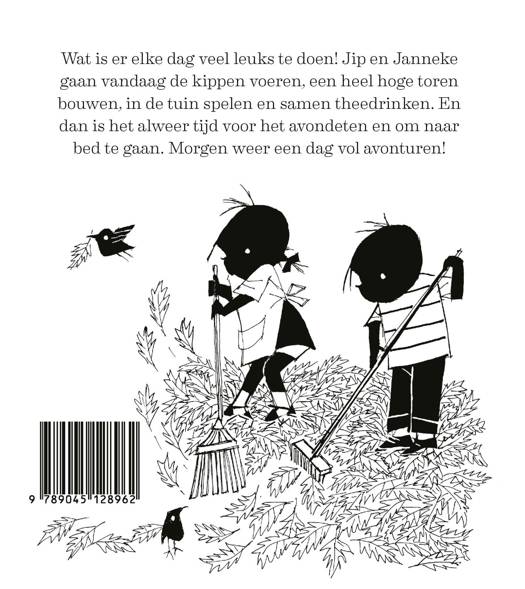 Stevig prentenboek met verhalen over een dag uit het leven van Jip en Janneke. Na het ontbijt gaan ze naar buiten met Takkie en Siepie. Ze helpen in huis met stofzuigen, wat toch lastiger blijkt dan gedacht. Natuurlijk spelen ze samen, wordt er gegeten en… moet er een verhaaltje voorgelezen worden voor het slapengaan!