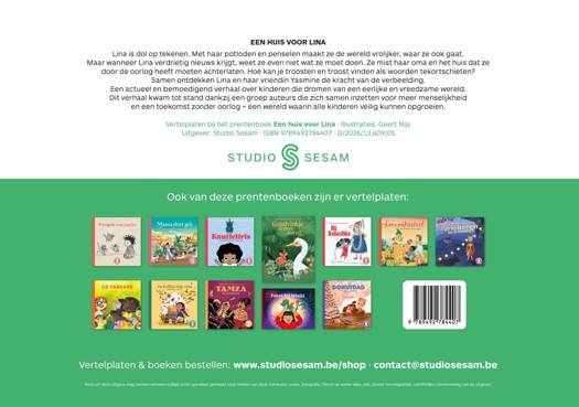 Hoe kan je troosten en troost vinden als woorden tekortschieten? Samen ontdekken Lina en haar vriendin Yasmine de kracht van de verbeelding. Een actueel en bemoedigend verhaal over kinderen die dromen van een eerlijke en vreedzame wereld. Met de vertelplaten Een huis voor Lina kan het verhaal in groep verteld worden. Lina is dol op tekenen. Met haar potloden en penselen maakt ze de wereld vrolijker, waar ze ook gaat. Maar wanneer Lina verdrietig nieuws krijgt, weet ze even niet wat ze moet doen. Ze mist haar oma en het huis dat ze door de oorlog heeft moeten achterlaten. Hoe kan je troosten en troost vinden als woorden tekortschieten? Samen ontdekken Lina en haar vriendin Yasmine de kracht van de verbeelding. Een actueel en bemoedigend verhaal over kinderen die dromen van een eerlijke en vreedzame wereld. Dit verhaal kwam tot stand dankzij een groep auteurs die zich samen inzetten voor meer menselijkheid en een toekomst zonder oorlog – een wereld waarin alle kinderen veilig kunnen opgroeien. Geert Nijs is een illustrator die zich vooral uit met zijn (digitale) potlood. Met prachtige illustraties en met oog voor detail brengt hij kleur in de wereld van kinderen. Hij illustreerde eerder de kinderboeken Knuffeldief en Knuffelfris bij Studio Sesam
