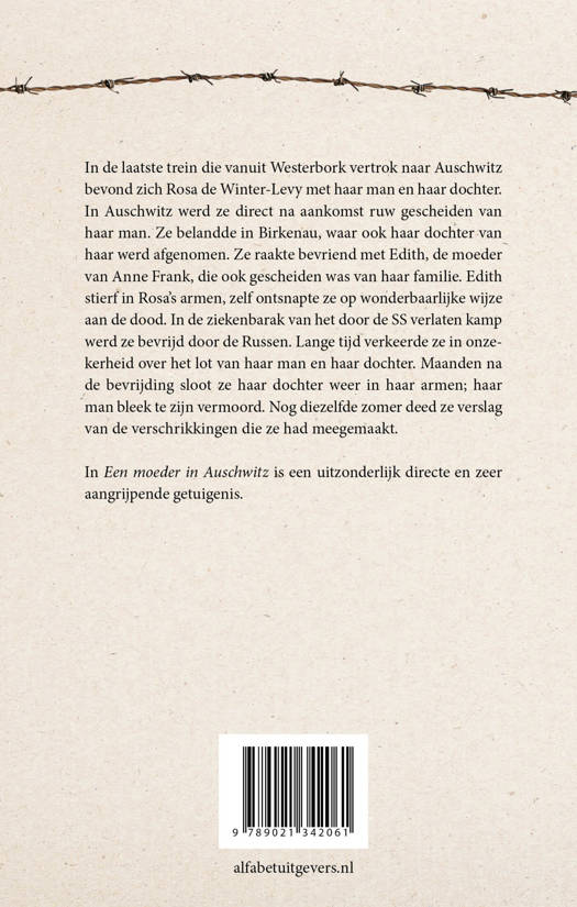 In de laatste trein die vanuit Westerbork vertrok naar Auschwitz bevond zich Rosa de Winter-Levy met haar man en haar dochter. In Auschwitz werd ze direct na aankomst ruw gescheiden van haar man. Ze belandde in Birkenau, waar ook haar dochter van haar werd afgenomen. Ze raakte bevriend met Edith, de moeder van Anne Frank, die ook gescheiden was van haar familie. Edith stierf in Rosa's armen, zelf ontsnapte ze op wonderbaarlijke wijze aan de dood. In de ziekenbarak van het door de SS verlaten kamp werd ze bevrijd door de Russen. Lange tijd verkeerde ze in onzekerheid over het lot van haar man en haar dochter. Maanden na de bevrijding sloot ze haar dochter weer in haar armen; haar man bleek te zijn vermoord. Nog diezelfde zomer deed ze verslag van de verschrikkingen die ze had meegemaakt. 'Een moeder in Auschwitz' is een uitzonderlijk directe en zeer aangrijpende getuigenis. Met een voowoord van Ronit Palache.