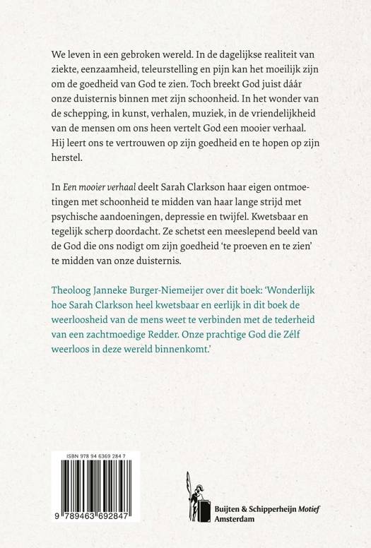 In Een mooier verhaal deelt Sarah Clarkson haar eigen ontmoetingen met schoonheid te midden van haar lange strijd met psychische aandoeningen, depressie en twijfel. Kwetsbaar en tegelijk scherp doordacht. Ze schetst een meeslepend beeld van de God die ons nodigt om zijn goedheid ‘te proeven en te zien’ te midden van onze duisternis.