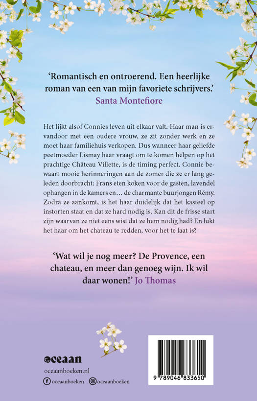 De heerlijke nieuwe roman van de favoriete schrijver van al jouw favoriete romance auteurs! O.a. Santa Montefiore, Jill Mansell, Katie Fforde en Jenny Colgan zijn fan! Het lijkt alsof Connies leven uit elkaar valt. Haar man is ervandoor met een oudere vrouw, ze zit zonder werk en ze moet haar familiehuis verkopen. Dus wanneer haar geliefde peetmoeder Lismay haar vraagt om te komen helpen op het prachtige Château Villette, is de timing perfect. Connie bewaart mooie herinneringen aan de zomer die ze er lang geleden doorbracht: Frans eten koken voor de gasten, lavendel ophangen in de kamers en… de charmante buurjongen Remy. Zodra ze aankomt, is het haar duidelijk dat het chateau op instorten staat en dat ze hard nodig is. Kan dit de frisse start zijn waarvan ze niet eens wist dat ze hem nodig had? En lukt het haar om het kasteel te redden, voor het te laat is? 'Romantisch en ontroerend. Een heerlijke roman van een van mijn favoriete schrijvers.' Santa Montefiore 'Deze roman is de perfecte ontsnapping!' Jill Mansell 'Wat wil je nog meer? De Provence, een chateau, en meer dan genoeg wijn. Ik wil daar wonen!' Jo Thomas
