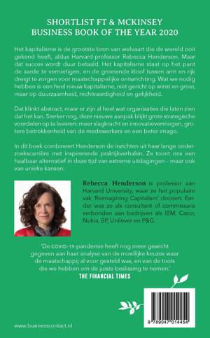 In ‘Een nieuw kapitalisme voor een wereld in verwarring’ legt Harvard-professor Rebecca Henderson uit dat alhoewel het kapitalisme de grootste bron van welvaart is die de wereld ooit gekend heeft, het succes ervan duur betaald wordt. Het kapitalisme staat op het punt de aarde te vernietigen, en de groeiende kloof tussen arm en rijk dreigt te zorgen voor maatschappelijke ontwrichting. Wat we nodig hebben is een heel nieuw kapitalisme, niet gericht op winst en groei, maar op duurzaamheid, rechtvaardigheid en gelijkheid.