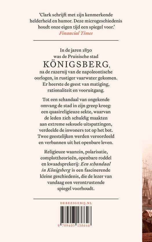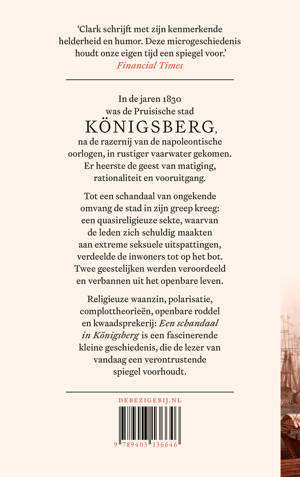 Tot een schandaal van ongekende omvang de stad in zijn greep kreeg: een quasireligieuze sekte, waarvan de leden zich schuldig maakten aan extreme seksuele uitspattingen, verdeelde de inwoners tot op het bot. Twee geestelijken werden veroordeeld en verbannen uit het openbare leven. Religieuze waanzin, polarisatie, complottheorieën, openbare roddel en kwaadsprekerij: Een schandaal in Königsberg is een fascinerende kleine geschiedenis, die de lezer van vandaag een verontrustende spiegel voorhoudt.