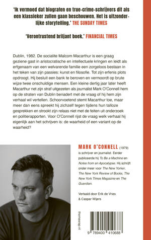 Dublin, 1982. De socialite Malcom Macarthur is een graag geziene gast in aristocratische en intellectuele kringen en leidt als erfgenaam van een welvarende familie een zorgeloos bestaan in het teken van zijn passies: kunst en filosofie. Tot zijn erfenis plots opdroogt. Hij besluit een bank te beroven en vermoordt op brute wijze twee onschuldige mensen. Een kleine dertig jaar later heeft Macarthur net zijn straf uitgezeten als journalist Mark O’Connell hem op de straten van Dublin benadert met de vraag of hij hem zijn verhaal wil vertellen. Schoorvoetend stemt Macarthur toe, maar meer dan eens spreekt hij zichzelf tegen tijdens hun talloze gesprekken en strookt zijn relaas niet met de feiten uit onderzoek en politierapporten. Voor O’Connell rijst de vraag welk verhaal hij eigenlijk aan het schrijven is: de waarheid of een variant op de waarheid?