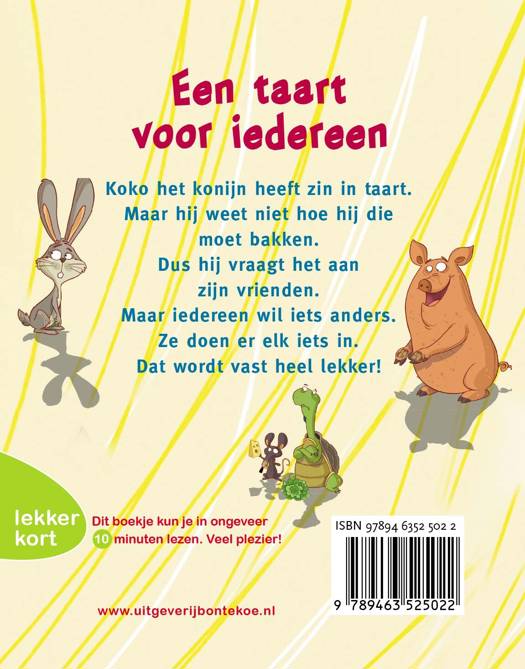 Koko het konijn heeft zin in taart. Maar hij weet niet hoe hij die moet bakken. Dus hij vraagt het aan zijn vrienden. Maar iedereen wil iets anders. Ze doen er elk iets in. Dat wordt vast heel lekker! Dit boekje kun je in ongeveer 10 minuten lezen