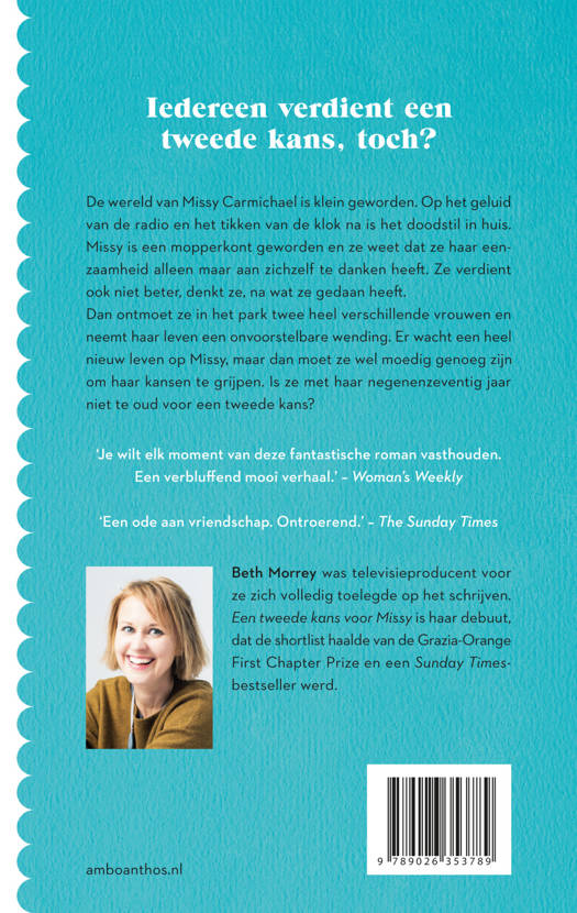 Een tweede kans voor Missy is een roman die doorspekt is met liefde, verlies en eenzaamheid, maar vooral met hoop. Het is een aangrijpend 'coming of old age'-verhaal waarin gewone dagen bijzonder worden door de kracht van vriendschap, saamhorigheid en vergiffenis voor jezelf, op welke leeftijd dan ook. Een tweede kans voor Missy van Beth Morrey is het hoopvolste debuut van 2021!