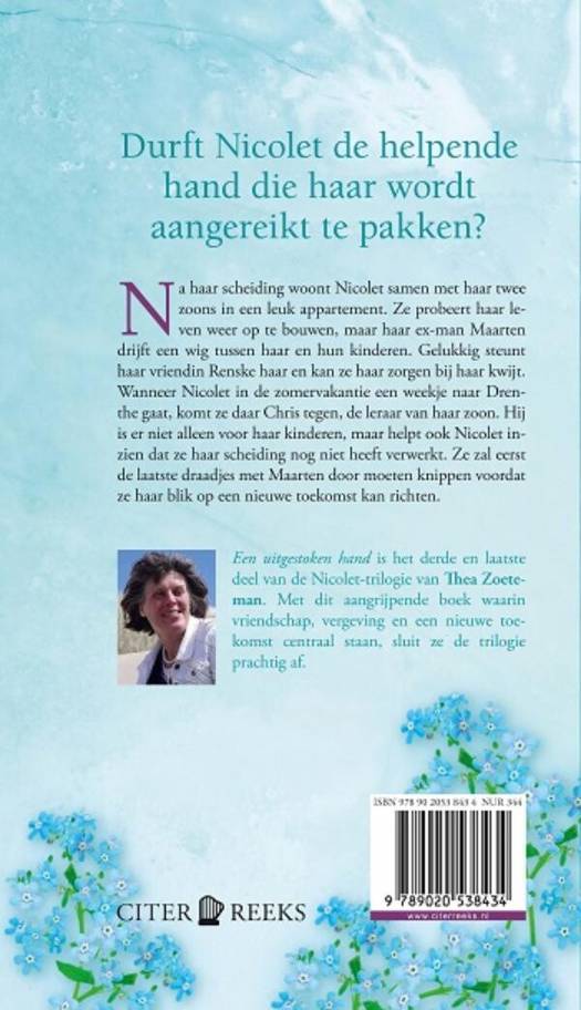 'Een uitgestoken hand' van Thea Zoeteman is een prachtige roman en een mooie afsluiter van de geliefde Nicolet-trilogie. Eerder verschenen in de serie 'Trouw aan een belofte' en 'Bittere waarheid'.