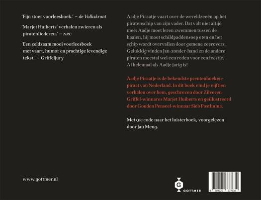 Marjet Huiberts en Sieb Posthuma creëerden in 2009 een figuurtje dat onmiddellijk duizenden harten veroverde: Aadje Piraatje. Sindsdien zijn de prentenboeken van Aadje Piraatje niet meer weg te denken uit kinderboekenland. De dikke bundel waarin alle geweldige verhalen zijn opgenomen, 'Aadje Piraatje - Een vat vol verhalen', blijft een van de mooiste cadeaus om een kind te geven. Via de luisterverhalen achter de QR-code in het boek - voorgelezen door meesterverteller Jan Meng - kunnen kinderen nu dubbel genieten van Aadje Piraatje.