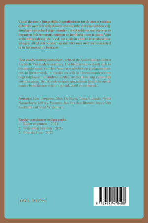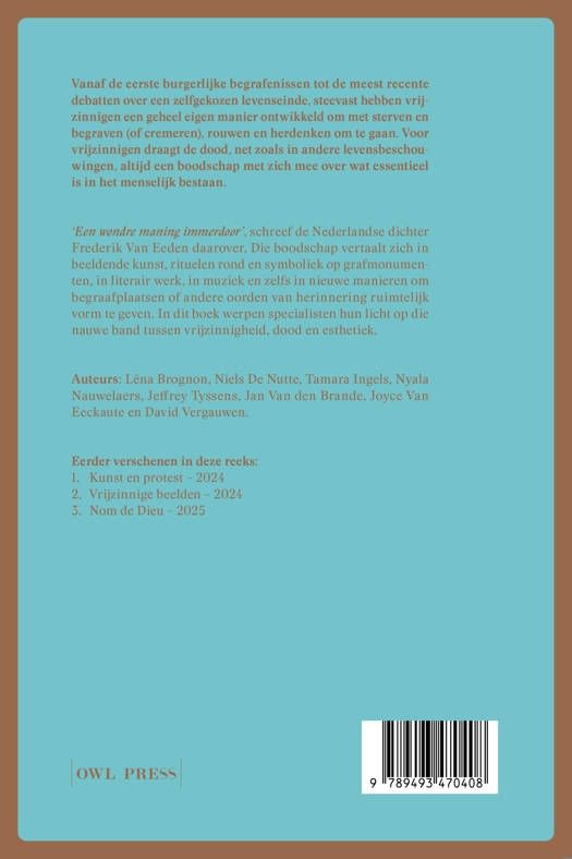 “Een wondre maning immerdoor”, schreef de Nederlandse dichter Frederik Van Eeden daarover. Die boodschap vertaalt zich in beeldende kunst, rituelen rond en symboliek op grafmonumenten, in literair werk, in muziek en zelfs in nieuwe manieren om begraafplaatsen of andere oorden van herinnering ruimtelijk vorm te geven. In dit boek werpen specialisten hun licht op die nauwe band tussen vrijzinnigheid, dood en esthetiek.
