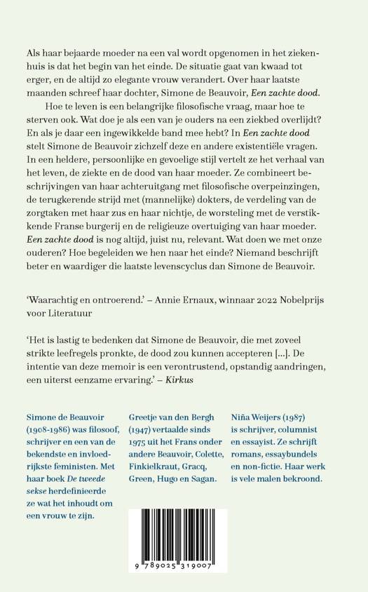 Hoe te leven is een belangrijke filosofische vraag, maar hoe te sterven ook. Wat doe je als een van je ouders na een ziekbed overlijdt? En als je daar een ingewikkelde band mee hebt? In Een zachte dood stelt Simone de Beauvoir zichzelf deze en andere existentiële vragen. In een heldere, maar persoonlijke stijl vertelt ze het verhaal over het leven, de ziekte en de dood van haar moeder. Ze combineert beschrijvingen van haar achteruitgang met filosofische overpeinzingen, de strijd met (mannelijke) dokters, de verdeling van de zorgtaak met haar zus en haar nichtje, de worsteling met de verstikkende Franse burgerij en de religieuze overtuiging van haar moeder. Een zachte dood is nog altijd, of juist nu, relevant. Wat doen we met onze ouderen? Hoe begeleiden we hen naar het einde? Niemand beschrijft beter en waardiger deze laatste levenscyclus dan Simone de Beauvoir.