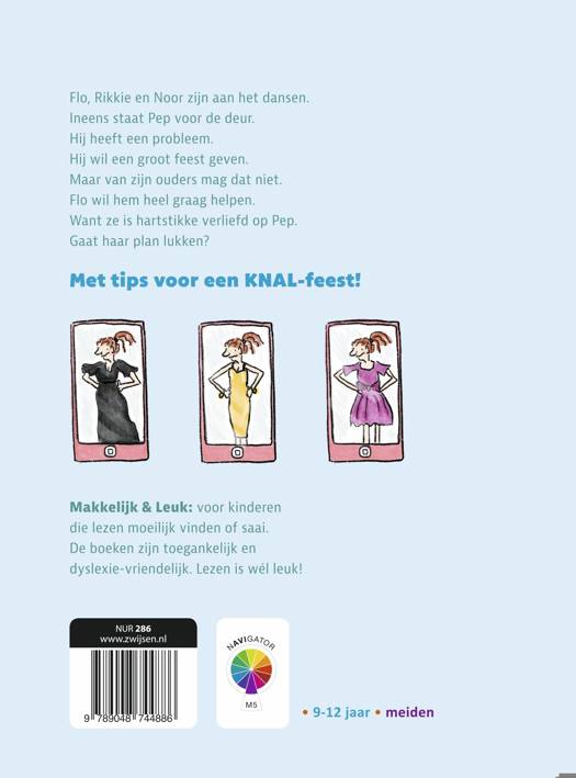Aansprekend meidenboek over Flo, Rikkie en Noor die van elk feest een knalfeest maken. Ze regelen taart, slingers, alles. Zelfs als het mis dreigt te gaan, zorgen ze voor een verrassende oplossing. Dit grappige boek op AVI M5 is voor kinderen van 9-12 jaar. De serie ‘Makkelijk & Leuk’ is voor kinderen die lezen moeilijk vinden of saai. Zo krijgen kinderen weer plezier in lezen. Dyslexievriendelijk!