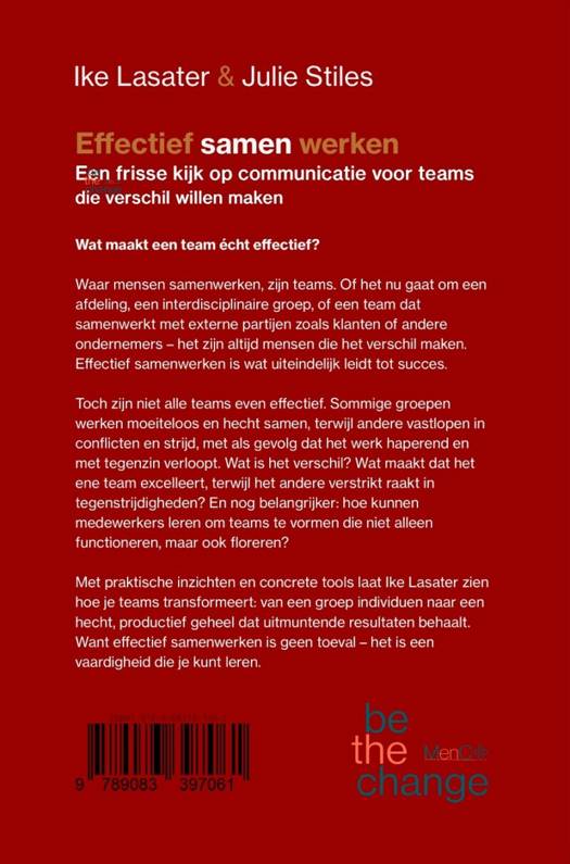 Met praktische inzichten en concrete tools laat Ike Lasater zien hoe je teams transformeert: van een groep individuen naar een hecht, productief geheel dat uitmuntende resultaten behaalt. Want effectief samenwerken is geen toeval – het is een vaardigheid die je kunt leren.