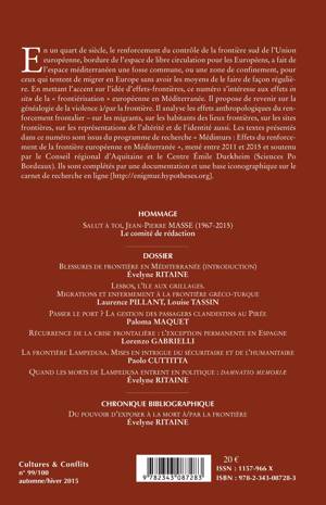 En un quart de siècle, le renforcement du contrôle de la frontière sud de l'Union européenne a fait de l'espace méditerranéen une fosse commune, ou une zone de confinement, pour ceux qui tentent de migrer en Europe sans avoir les moyens de le faire de façon régulière. En mettant l'accent sur l'idée d'effets-frontières, ce numéro s'intéresse aux effets in situ de la « frontiérisation » européenne en Méditerranée. Il propose de revenir sur la généalogie de la violence à/par la frontière et analyse les effets anthropologiques du renforcement frontalier.