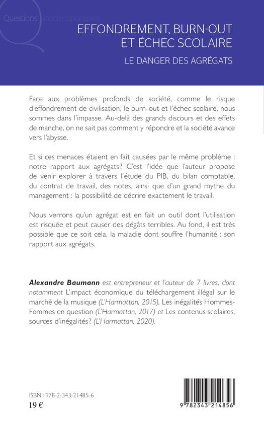 Face aux problèmes profonds de société, comme le risque d'effondrement de civilisation, le burn-out et l'échec scolaire, nous sommes dans l'impasse. Au-delà des grands discours et des effets de manche, on ne sait pas comment y répondre et la société avance vers l'abysse. Et si ces menaces étaient en fait causées par le même problème : notre rapport aux agrégats ? C'est l'idée que l'auteur propose de venir explorer à travers l'étude du PIB, du bilan comptable, du contrat de travail, des notes, ainsi que d'un grand mythe du management : la possibilité de décrire exactement le travail. Nous verrons qu'un agrégat est en fait un outil dont l'utilisation est risquée et peut causer des dégâts terribles.