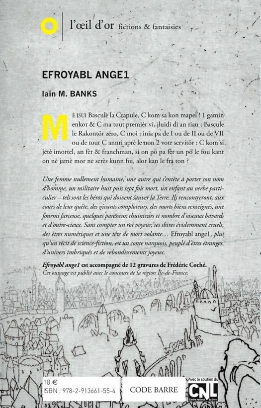 Une femme nullement humaine, une autre qui s'entête à porter son nom d'homme, un militaire huit puis sept fois mort, un enfant au verbe particulier - tels sont les héros qui doivent sauver la Terre. Ils rencontreront, aux cours de leur quête, des vivants comploteurs, des morts biens renseignés, une fourmi farceuse, quelques paresseux chuinteurs et nombre d'oiseaux bavards et d'outre-cieux. Sans compter un roi voyeur, ses sbires évidemment cruels, des êtres numériques et une tête de mort volante... Efroyabl ange1, plus qu'un récit de science-fiction, est un conte narquois, peuplé d'êtres étranges, d'univers imbriqués et de rebondissements joyeux.