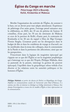 Révéler l'organisation des activités de l'Église, du sommet à la base, est un devoir pour tout adepte attentionné. Expérience de pèlerinage d'un autre genre, l'ouvrage prend naissance avec la célébration, en 2023, des 35 ans de prêtrise de l'auteur. Il cristallise, d'une part, les 70 ans du séminaire de Makoua et ceux de la paroisse de Kellé; d'autre part, le centenaire de Kindamba et les 30 ans du rappel à Dieu de Mgr Georges Firmin Singha. L'ossature porte sur les divergences dans le budget de fête et dans les conditions de voyage et d'accueil; sur les similitudesdans la tenue des colloques, dans le commentaire de la Parole et dans la pertinence des allocutions; ainsi que sur les perspectives. S'inscrivant dans la logique du magistère épiscopal qui s'appuie sur ce que dit l'Église et sur le magistère prophétique qui s'interroge sur ce que dit l'Esprit, Philippe Mabiala, dans sa pastorale de la pensée, interroge la gestion du pouvoir épiscopal, l'équilibre dans la géopolitique ethno-tribale d'un diocèse et les relations entre les autorités politiques et les hommes d'Église.