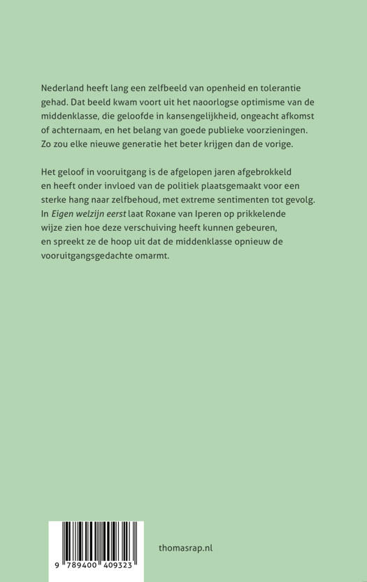 Het geloof in vooruitgang is de afgelopen jaren afgebrokkeld en heeft onder invloed van de politiek plaatsgemaakt voor een sterke hang naar zelfbehoud, met extreme sentimenten tot gevolg. In Eigen welzijn eerst laat Roxane van Iperen op prikkelende wijze zien hoe dit heeft kunnen gebeuren, en spreekt ze de hoop uit dat de middenklasse opnieuw de vooruitgangsgedachte omarmt.