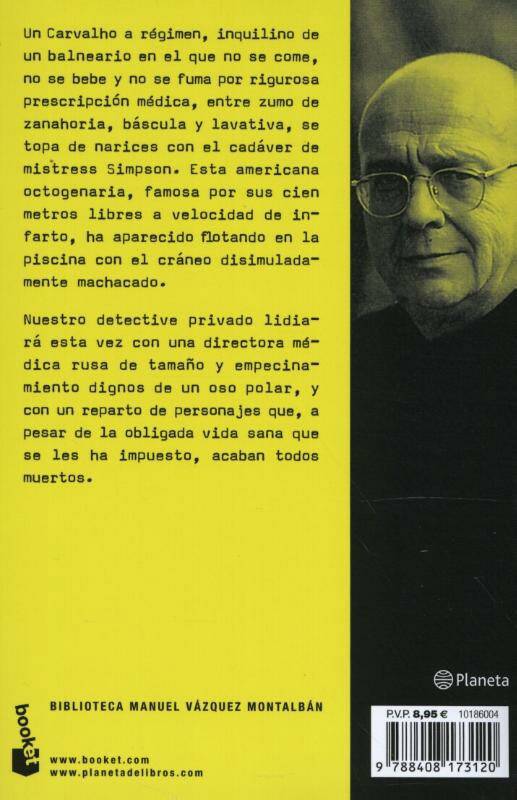 Un Carvalho a régimen, inquilino de un balneario en el que no se come, no se bebe y no se fuma por rigurosa prescripción médica, entre zumo de zanahoria, báscula y lavativa, se topa de narices con el cadáver de Mistress Simpson. Esta americana octogenaria, famosa por sus cien metros libres a velocidad de infarto, ha aparecido flotando en la piscina con el cráneo disimuladamente machacado. Carvalho, que para mantener las tradiciones quemará libros a hurtadillas, lidiará esta vez con una directora médica rusa de tamaño y empecinamiento dignos de un oso polar, y con un reparto de personajes que, a pesar de la obligada vida sana que se les ha impuesto, acaban todos muertos.