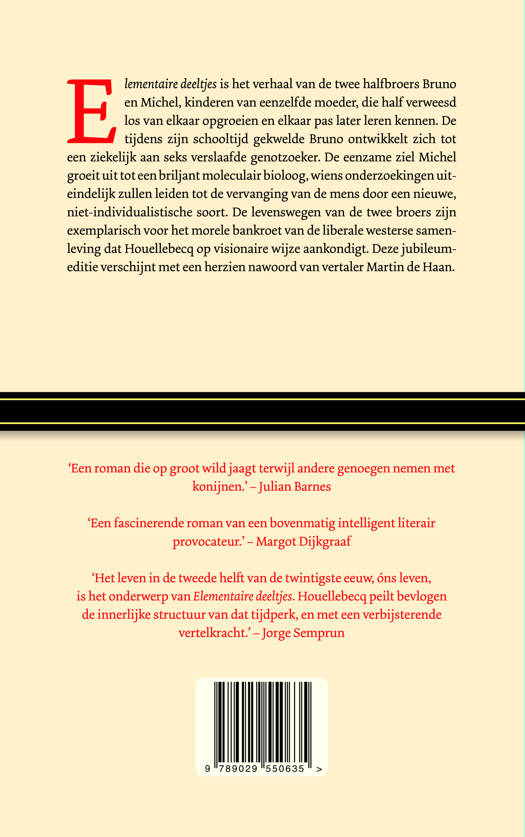 Elementaire deeltjes is het verhaal van de twee halfbroers Bruno en Michel, kinderen van eenzelfde moeder, die half verweesd los van elkaar opgroeien en elkaar pas later leren kennen. De tijdens zijn schooltijd gekwelde Bruno ontwikkelt zich tot een ziekelijk aan seks verslaafde genotzoeker. De eenzame ziel Michel groeit uit tot een briljant moleculair bioloog, wiens onderzoekingen uiteindelijk zullen leiden tot de vervanging van de mens door een nieuwe, niet-individualistische soort. De levenswegen van de twee broers zijn exemplarisch voor het morele bankroet van de liberale westerse samenleving dat Houellebecq op visionaire wijze aankondigt.
