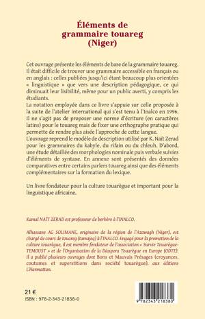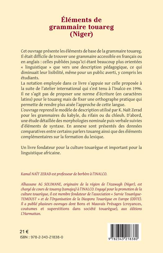 Cet ouvrage présente les éléments de base de la grammaire touarègue. Il s’agit ici de fixer une orthographe qui permette de rendre plus aisée l’approche de cette langue, en reposant sur une étude détaillée des morphologies nominales et verbales, suivis d’éléments de syntaxe. En annexe sont présentés des données comparatives entre certains parlers touaregs ainsi que des éléments complémentaires sur la formation du lexique.