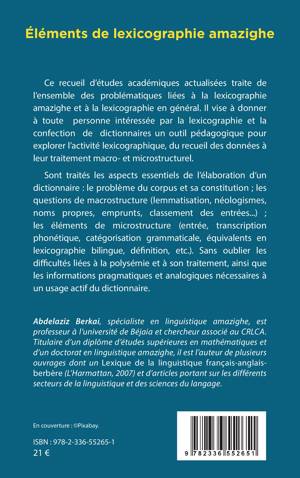 Ce recueil d'études académiques actualisées traite de l'ensemble des problématiques liées à la lexicographie amazighe et à la lexicographie en général. Il vise à donner à toute personne intéressée par la lexicographie et la confection de dictionnaires un outil pédagogique pour explorer l'activité lexicographique, du recueil des données à leur traitement macro- et microstructurel. Sont traités les aspects essentiels de l'élaboration d'un dictionnaire: le problème du corpus et sa constitution; les questions de macrostructure (lemmatisation, néologismes, noms propres, emprunts, classement des entrées...); les éléments de microstructure (entrée, transcription phonétique, catégorisation grammaticale, équivalents en lexicographie bilingue, définition, etc.). Sans oublier les difficultés liées à la polysémie et à son traitement, ainsi que les informations pragmatiques et analogiques nécessaires à un usage actif du dictionnaire.