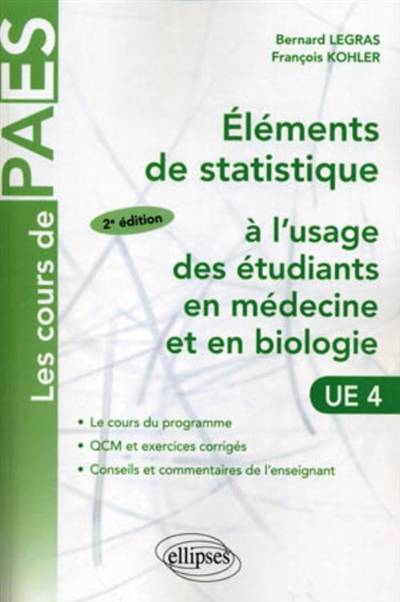 Traite des statistiques descriptives, des éléments de probabilité, de la méthode statistique (estimation et tests), L'orientation médicale apparaît dans l'étude de plusieurs sujets (valeur d'un test, test Kappa, essai comparatif, courbes de survie, éléments d'analyse multifactorielle) et dans le choix des exercices, classiques ou sous forme de QCM qui sont tous corrigés.