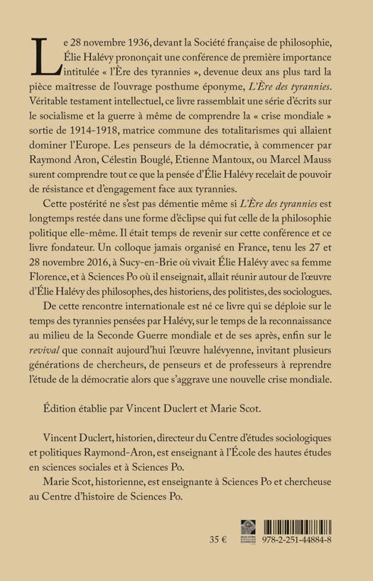 Le 28 novembre 1936, devant la Societe francaise de philosophie, Elie Halevy prononcait une conference de premiere importance intitulee l'Ere des tyrannies, devenue deux ans plus tard la piece maitresse de l'ouvrage posthume eponyme, L'Ere des tyrannies. Veritable testament intellectuel, ce livre rassemblait une serie d'ecrits sur le socialisme et la guerre a meme de comprendre la crise mondiale sortie de 1914-1918, matrice commune des totalitarismes qui allaient dominer l'Europe. Les penseurs de la democratie, a commencer par Raymond Aron, Celestin Bougle, Etienne Mantoux, ou Marcel Mauss surent comprendre tout ce que la pensee d'Elie Halevy recelait de pouvoir de resistance et d'engagement face aux tyrannies. Cette posterite ne s'est pas dementie meme si L'Ere des tyrannies est longtemps restee dans une forme d'eclipse qui fut celle de la philosophie politique elle-meme. Il etait temps de revenir sur cette conference et ce livre fondateur. Un colloque jamais organise en France, tenu les 27 et 28 novembre 2016, a Sucy-en-Brie ou vivait Elie Halevy avec sa femme Florence, et a Sciences Po ou il enseignait, allait reunir autour de l'oeuvre d'Elie Halevy des philosophes, des historiens, des politistes, des sociologues. De cette rencontre internationale est ne ce livre qui se deploie sur le temps des tyrannies pensees par Halevy, sur le temps de la reconnaissance au milieu de la Seconde Guerre mondiale et de ses apres, enfin sur le revival que connait aujourd'hui l'oeuvre halevyenne, invitant plusieurs generations de chercheurs, de penseurs et de professeurs a reprendre l'etude de la democratie alors que s'aggrave une nouvelle crise mondiale.