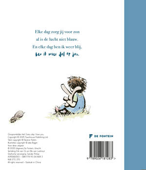 Elke dag weer dol op jou vertelt aan de hand van de prachtige illustraties van Jake Biggin hoe fijn het is om samen te zijn, alle dagen van de week. Een perfect voorleesboek voor jonge kinderen, maar ook een prachtig cadeauboek voor geliefden, ouders of vrienden: voor iedereen met wie je elke dag opnieuw wil delen.