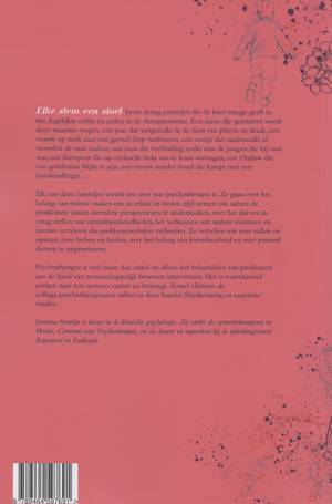 Elke stem een stoel bevat dertig cursiefjes die de lezer inzage geeft in het dagelijks reilen en zeilen van de therapieruimte. Een dame die geteisterd wordt door waarom-vragen, een paar dat vastgeraakt in de dans van platvis en draak, een vrouw op zoek naar een gevoel diep vanbinnen, een meisje dat onderzoekt of woorden de man maken, een man die verbinding zoekt met de jongen die hij ooit was, een therapeut die op ezeltocht trekt om te leren vertragen, een Outlaw die een gentleman blijkt te zijn, een vrouw zonder hond die kampt met een hondenallergie...