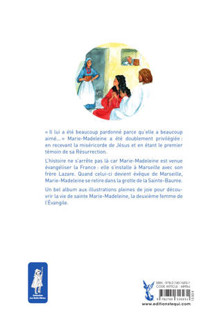 La vie de sainte Marie-Madeleine, la deuxième femme de l'Evangile, telle qu'elle est décrite principalement par saint Luc et saint Jean : enlisée dans le mal et pleurant ses péchés, guérie et relevée par Jésus, le suivant généreusement avec les apôtres, l'écoutant avec vénération, versant le parfum sur sa tête, priant et pleurant au pied de la croix. Le jour de Pâques, Jésus lui apparait près du tombeau vide, lui donnant la mission d'annoncer sa résurrection aux apôtres. La dernière partie du livre retrace l'épopée des proches amis de Jésus après la Pentecôte : persécutés par Hérode Agrippa, ils sont jetés à l'aventure sur une barque qui finira par accoster en Provence, au lieu dit depuis Les Saintes Marie de la mer. Lazare et Marie-Madeleine évangélisent les Marseillais, Marthe part vers Tarascon, Maximin et Sidoine à Aix-en-Provence. Lazare deviendra évêque de Marseille, tandis que Marie-Madeleine, elle, se retire dans la grotte de la Sainte Baume. Ce haut-lieu de pèlerinage en Provence depuis des siècles, gardé par les Dominicains, est considéré comme le troisième tombeau de la Chrétienté. Dès 6 ans.