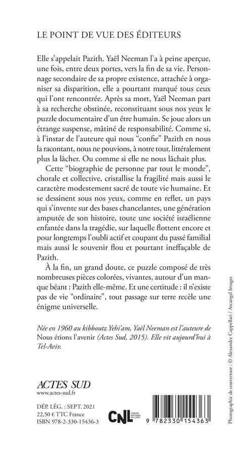 Elle s'appelait Pazith. Yaël Neeman l'a à peine aperçue, une fois, entre deux portes, vers la fin de sa vie. Personnage secondaire de sa propre existence, attachée à organiser sa disparition, elle a pourtant marqué tous ceux qui l'ont rencontrée. Après sa mort, Yaël Neeman part à sa recherche obstinée, reconstituant sous nos yeux le puzzle documentaire d'un être humain. Se joue alors un étrange suspense, mâtiné de responsabilité. Comme si, à l'instar de l'auteure qui nous "confie" Pazith en nous la racontant, nous ne pouvions, à notre tour, littéralement plus la lâcher. Ou comme si elle ne nous lâchait plus. Cette "biographie de personne par tout le monde", chorale et collective, cristallise la fragilité mais aussi le caractère modestement sacré de toute vie humaine. Et se dessinent sous nos yeux, comme en reflet, un pays qui s'invente sur des bases chancelantes, une génération amputée de son histoire, toute une société israélienne enfantée dans la tragédie, sur laquelle flottent encore et pour longtemps l'oubli actif et coupant du passé familial mais aussi le souvenir flou et pourtant ineffaçable de Pazith. À la fin, un grand doute, ce puzzle composé de très nombreuses pièces colorées, vivantes, autour d'un manque béant : Pazith elle-même. Et une certitude : il n'existe pas de vie "ordinaire", tout passage sur terre recèle une énigme universelle.