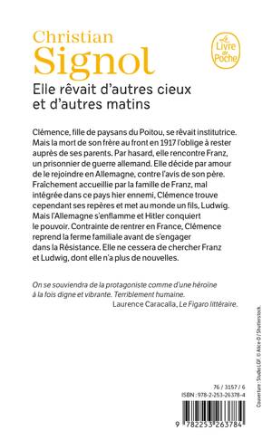 Clémence, fille de paysans du Poitou, se rêvait institutrice. Mais la mort de son frère au front en 1917 l’oblige à rester auprès de ses parents. Par hasard, elle rencontre Franz, un prisonnier de guerre allemand. Elle décide par amour de le rejoindre en Allemagne, contre l’avis de son père. Fraîchement accueillie par la famille de Franz, mal intégrée dans ce pays hier ennemi, Clémence trouve cependant ses repères et met au monde un fils, Ludwig. Mais l’Allemagne s’enflamme et Hitler conquiert le pouvoir. Contrainte de rentrer en France, Clémence reprend la ferme familiale avant de s’engager dans la Résistance. Elle ne cessera de chercher Franz et Ludwig dont elle n’a plus de nouvelles.