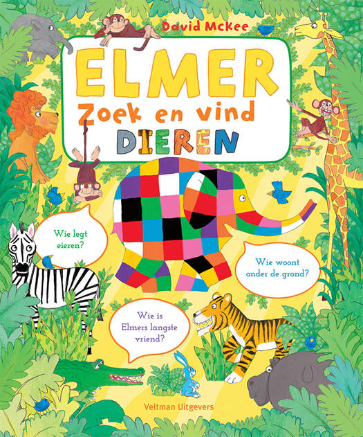 Kun jij Elmer op elke bladzijde vinden? Doe mee met Elmers zoek-en-vind-avontuur in het oerwoud!