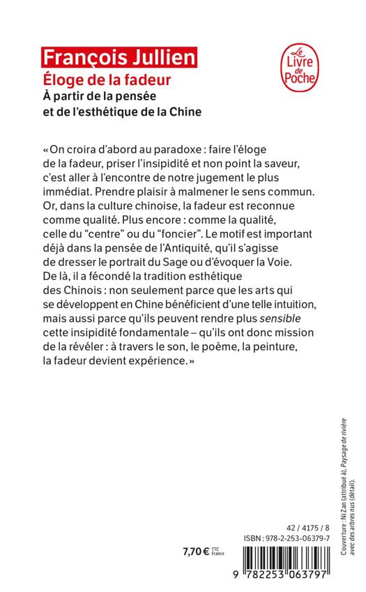 On croira d’abord au paradoxe : faire l’éloge de la fadeur, priser l’insipidité et non point la saveur, c’est aller à l’encontre de notre jugement le plus immédiat. Prendre plaisir à malmener le sens commun. Or, dans la culture chinoise, la fadeur est reconnue comme qualité. Plus encore : comme la qualité, celle du « centre », de la « base ». Le motif est important déjà dans la pensée de l’Antiquité, qu’il s’agisse de dresser le portrait du Sage ou d’évoquer la Voie. De là, il a fécondé la tradition esthétique des Chinois : non seulement parce que les arts qui se développent en Chine bénéficient d’une telle intuition, mais aussi parce qu’ils peuvent rendre plus sensible cette insipidité fondamentale – ils ont donc mission de la révéler : à travers le son, le poème, la peinture, la fadeur devient expérience.