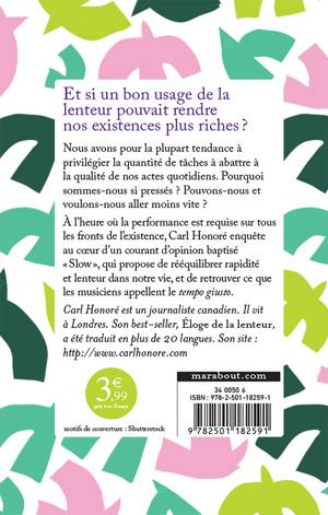 Et si un bon usage de la lenteur pouvait rendre nos existences plus riches ? Pourquoi sommes-nous si pressés ? Pouvons-nous et voulons-nous aller moins vite ? Nous avons décidément tendance à privilégier la quantité des tâches à abattre à la qualité de nos actes quotidiens. A l'heure où la performance est requise sur tous les fronts de l'existence (travail, couple, famille, vie sociale et même... loisirs !), Carl Honoré enquête au coeur d'un courant d'opinion baptisé " Slow ", qui propose de rééquilibrer rapidité et lenteur dans notre vie, et retrouver ce que les musiciens appellent tempo giusto.