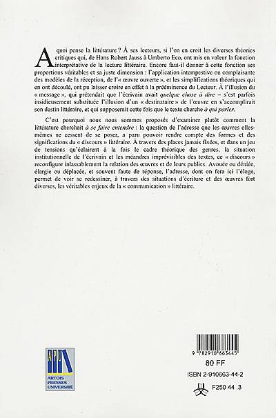 Examine la question de la littérature dite adressée, c'est-à-dire une littérature qui manifeste la présence de son destinataire. Avouée ou déniée, élargie ou déplacée, et souvent faute de réponse, l'adresse permet de voir se redessiner les véritables enjeux de la communication littéraire.