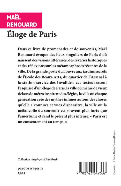 Dans ce livre de promenades et de souvenirs, Maël Renouard évoque des lieux singuliers de Paris d'où naissent des visions littéraires, des rêveries historiques et des réflexions sur les métamorphoses récentes de la ville. De la grande poste du Louvre aux jardins secrets de l'École des Beaux-Arts, du quartier de l'Arsenal à la station-service des Invalides, ces textes tracent l'esquisse d'un éloge de Paris, la ville où même de vieux tickets de métro inspirent des élégies, la ville où chaque génération crée des mythes infimes autour des choses qu'elle a connues et vues disparaître, la ville où la mélancolie du souvenir est souvent plus forte que l'amertume et rend le présent plus intense. « Paris est un consentement au temps.»