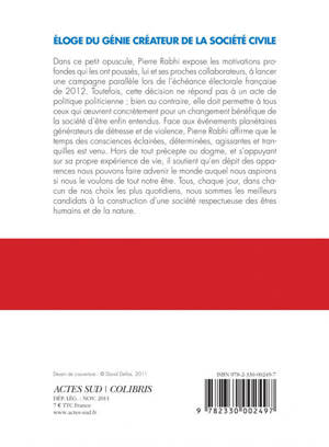 Dans cet opuscule, Pierre Rabhi expose les motivations profondes qui l'ont poussé, avec ses amis, collaborateurs et collaboratrices, à lancer une campagne parallèle lors de l'échéance électorale française de 2012. Il ne s'agit en aucun cas d'entrer en politique politicienne mais de permettre à tous ceux qui, avec conscience, conviction et détermination, oeuvrent concrètement pour un changement bénéfique de la société, d'être enfin entendus. Face aux événements planétaires générateurs de détresse et de violence, il affirme que le temps des consciences éclairées, déterminées, agissantes et tranquilles est venu.
