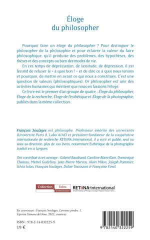 Pourquoi faire un éloge du philosopher ? Pour distinguer le philosopher de la philosophie et pour éclairer la valeur du faire philosophique, qu'il produise des problèmes, des hypothèses, des thèses et des concepts ou bien des modes de vie. En ces temps de dépréciation, de lassitude, de dépression, il est fécond de refuser le à quoi bon ! et de dire ce à quoi nous tenons et pourquoi, de mettre en avant ce qui nous a constitués. C'est une question de valeurs (philosophiques). Or philosopher est une des activités humaines qui méritent que nous en fassions l'éloge. Ce livre est le premier d'un groupe de quatre: Éloge du philosopher, Éloge de la recherche, Éloge de l'esthétique et Éloge de la photographie, publiés dans la même collection.