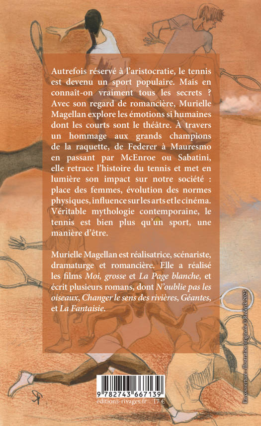 Autrefois réservé à l'aristocratie, le tennis est devenu un sport universel. Mais en connaît-on vraiment tous les secrets ? Avec son regard de romancière, Murielle Magellan explore les émotions si humaines dont les courts sont le théâtre. À travers un hommage aux grands champions de la raquette, de Federer à Mauresmo en passant par McEnroe ou Navratilova, elle retrace l'histoire du tennis et met en lumière son impact sur notre société : place des femmes, évolution des normes physiques, influence sur les arts et le cinéma. Véritable mythologie contemporaine, le tennis est bien plus qu'un sport : c'est une manière d'être. Murielle Magellan est réalisatrice, scénariste, dramaturge et romancière. Elle a réalisé les films Moi, grosse et La Page blanche et écrit plusieurs romans, dont N'oublie pas les oiseaux, Changer le sens des rivières, Géantes, et La Fantaisie.